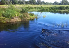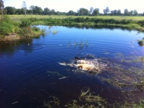 Ihre erste Wasserarbeit absolvierte Wicki im Teich von Gerd Ulken, gemeinsam mit seinem DD Rüden Kalle ganz hervorragend.