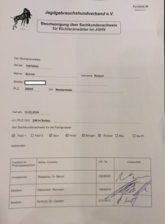 Vielen Dank an die Richter und Prüfungsleitung sowie die Helfer bei der Einarbeitung.